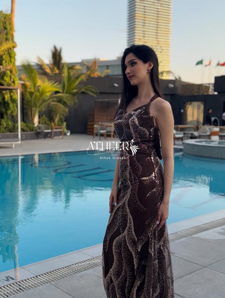 فستان بني غامق بتطريز ذهبي لامع من متجر فساتين أثير أفضل متجر فساتين سعودي، يجمع بين الأناقة والفخامة بتصميمه الانسيابي والخامة المطرّزة. هذا الفستان المثالي للمناسبات الخاصة يضفي عليكِ لمسة من التألق.