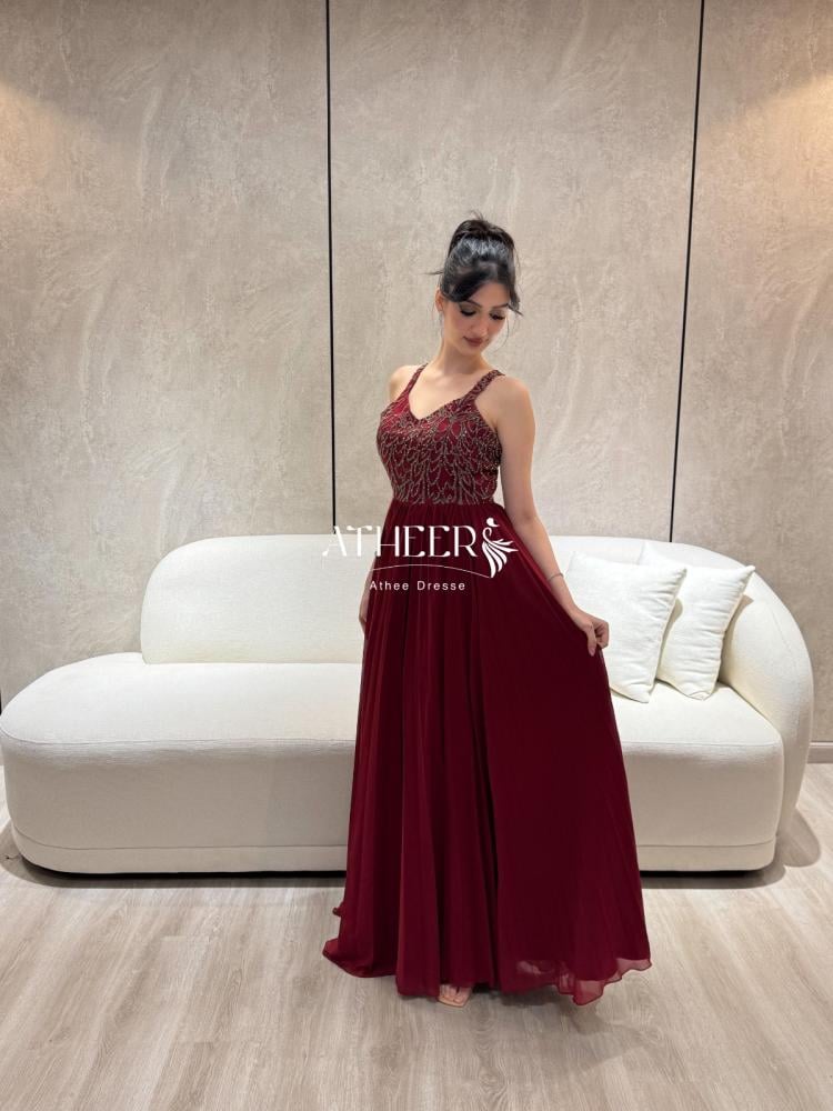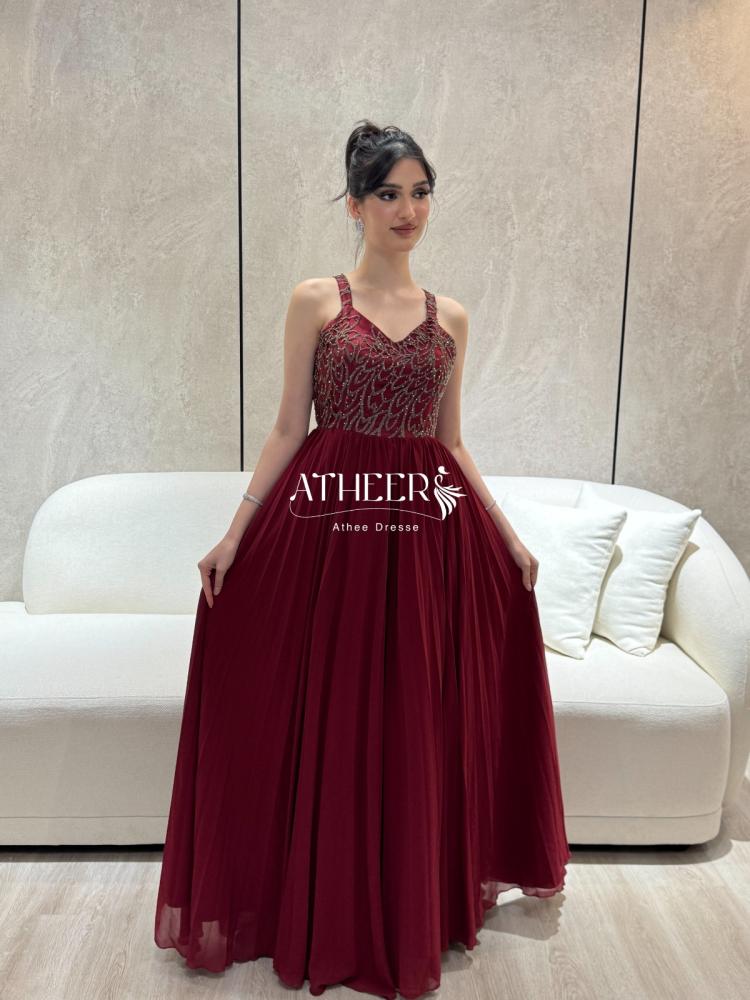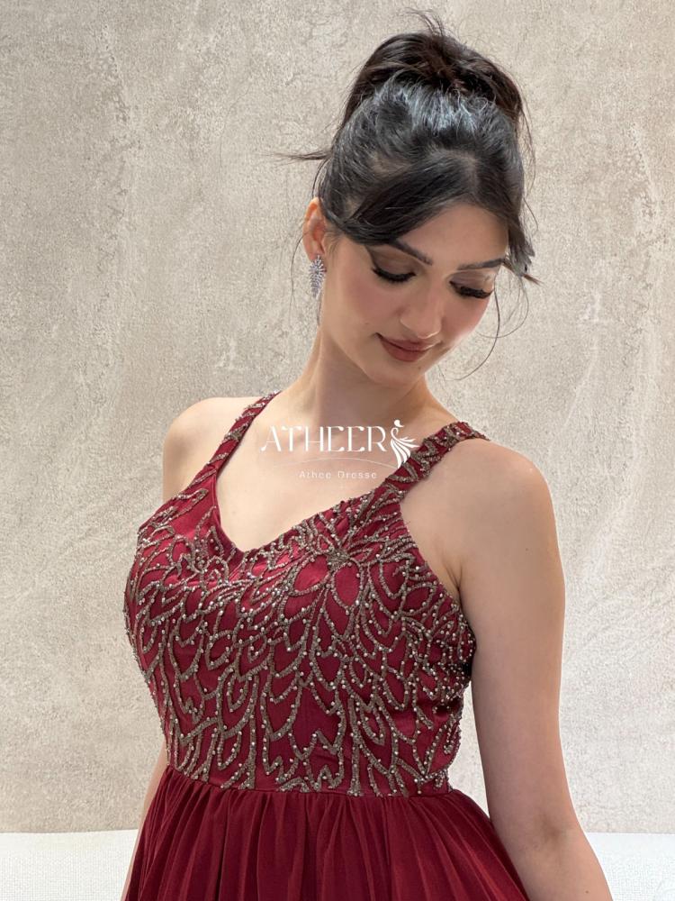 أبهري الجميع بإطلالة استثنائية مع فستان سهرة طويل أحمر مطرز بنقوش من متجر فساتين أثير أفضل متجر فساتين سعودي. فستان يجمع بين الفخامة الملكية والتفاصيل العصرية بفضل تطريزاته الفنية الدقيقة وتصميمه الانسيابي، ما يجعله اختيارًا مثاليًا لكل امرأة تبحث عن التميّز في المناسبات الخاصة.