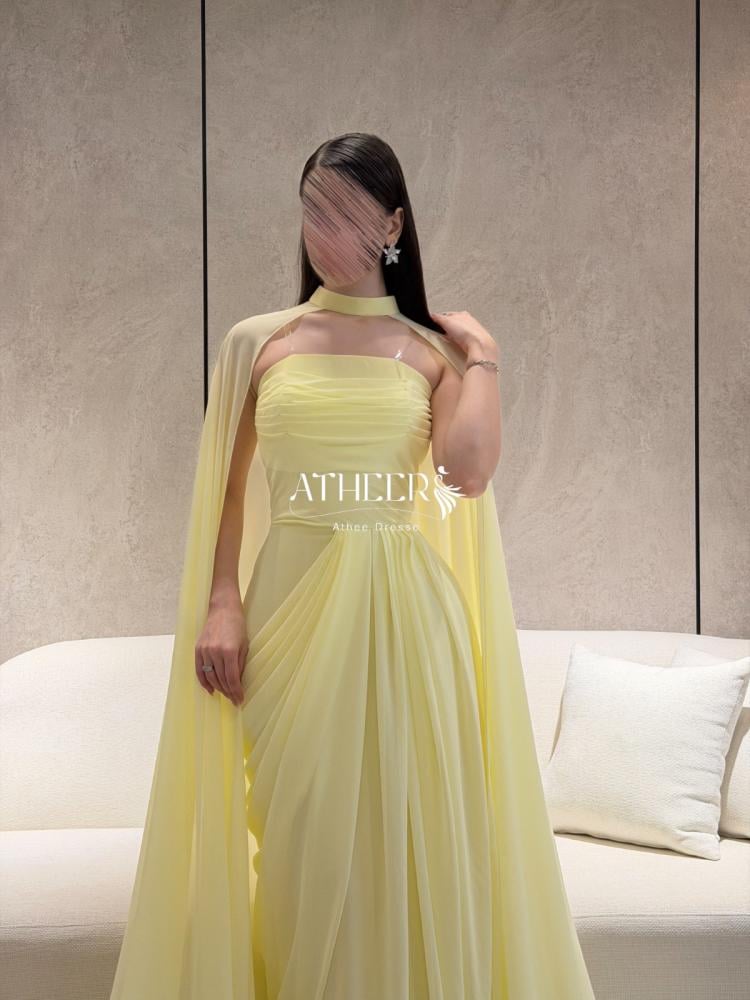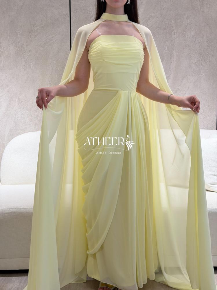 فستان سهرة طويل أصفر فاتح بياقة عنق ووشاح طويل | فستان مِيرال