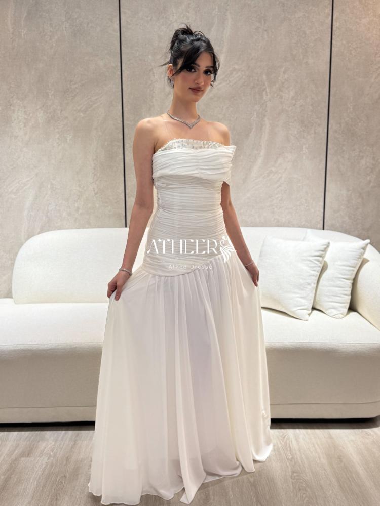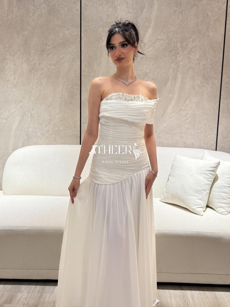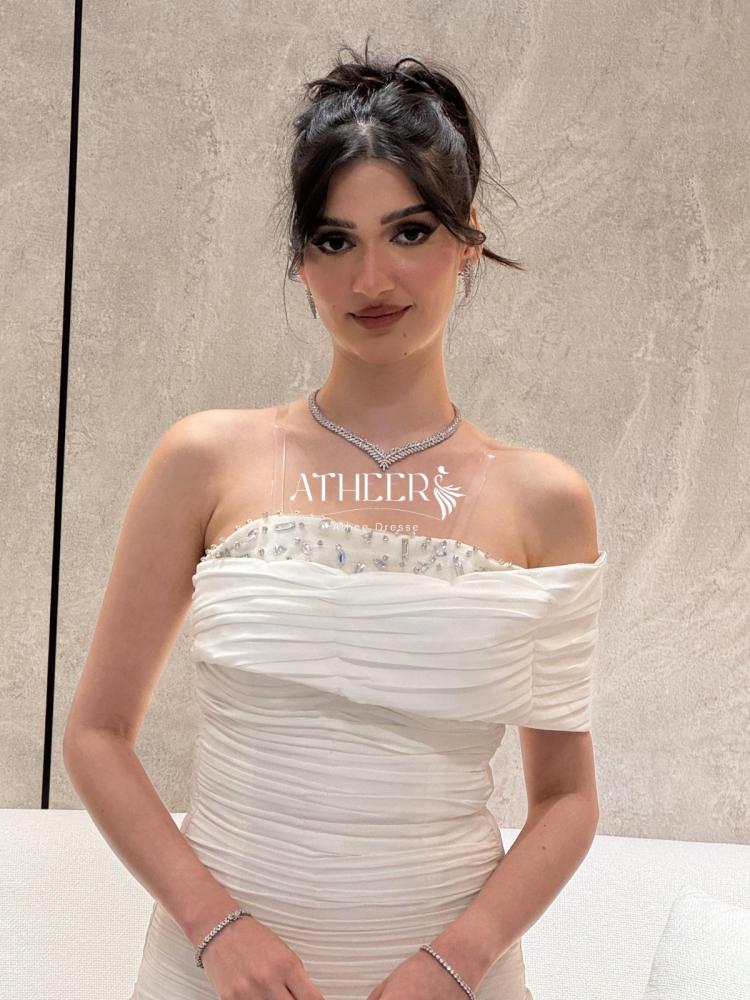 فستان سهرة طويل بلون أبيض عاجي من متجر فساتين أثير أفضل متجر فساتين سعودي بتصميم راقٍ يجمع بين البساطة المترفة والأناقة الكلاسيكية. يتميز الفستان بقصة جذابة تبرز أنوثتك بخامة فاخرة تلتف حول الجسم بانسيابية مبهرة، ويعتبر خيارًا مثاليًا لكل امرأة تبحث عن إطلالة ناعمة وفاخرة في المناسبات الخاصة.