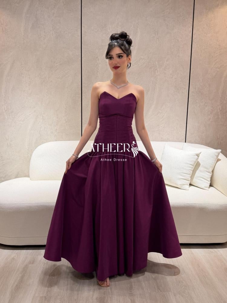 فستان سهرة طويل بلون بنفسجي داكن بقصة قلب وخصر مكشكش | فستان رُبى