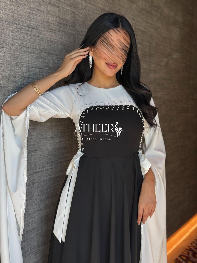 فستان سهرة طويل خامة باربي وتفتة من متجر أثير في السعودية، تصميم أنيق باللون الأسود والأبيض، مثالي للسهرات والمناسبات. تسوقي الآن بأفضل العروض الحصرية ودفع مريح عبر تابي وتمارا. كوني الأجمل في كل مناسبة!"