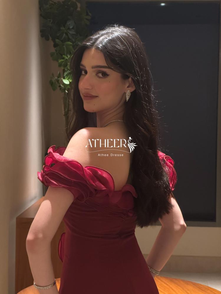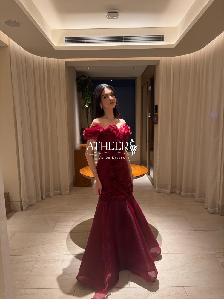 فستان سهرة عنابي تصميم وردة 3D – موديل روزان حورية فاخرة