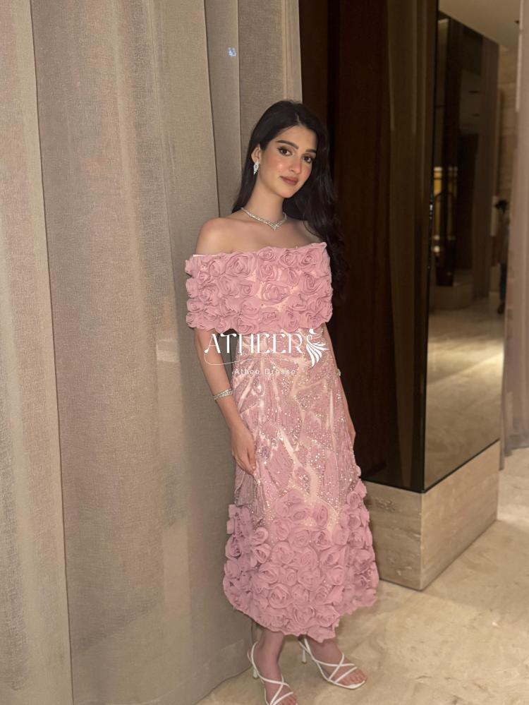 بكل نعومة وفخامة، يأتي فستان “سدين” ليمنحك حضورًا لا يُنسى. التصميم الأوف شولدر المزيّن بالورود ثلاثية الأبعاد يمنح إطلالتك لمسة ملكية، بينما تنسدل التطريزات اللامعة برقي على القماش الوردي لتبرز جمالك بكل تفاصيله. الخيار الأمثل للمناسبات التي تتطلب منكِ التفرّد.