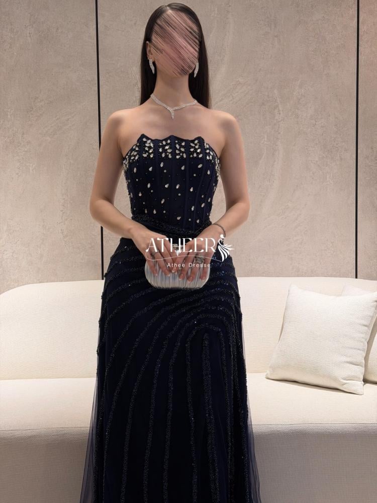 فستان سهره طويل صك كحلي بشق جانبي مطرز | فستان ريوف