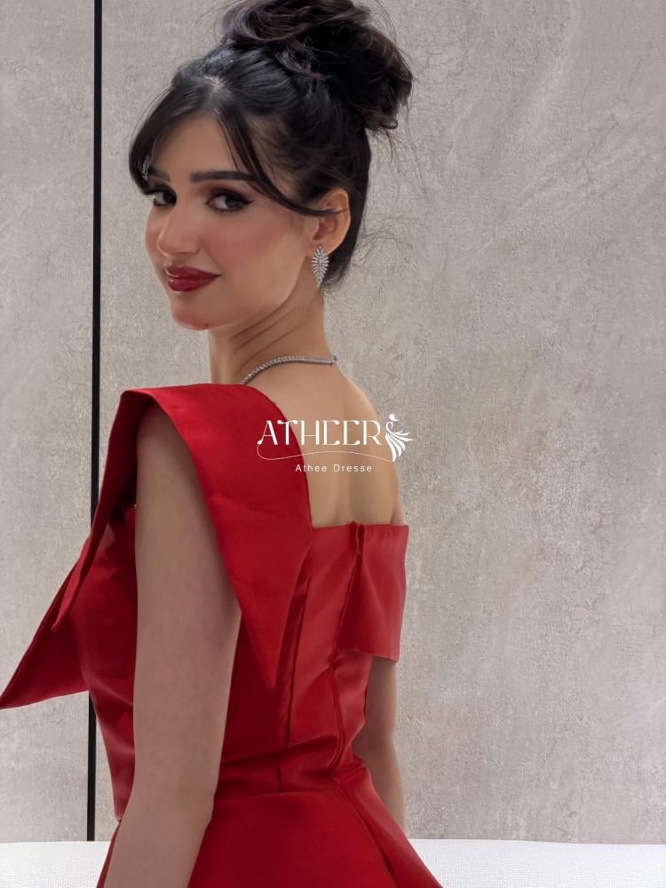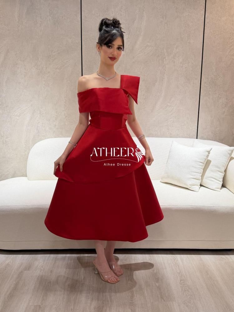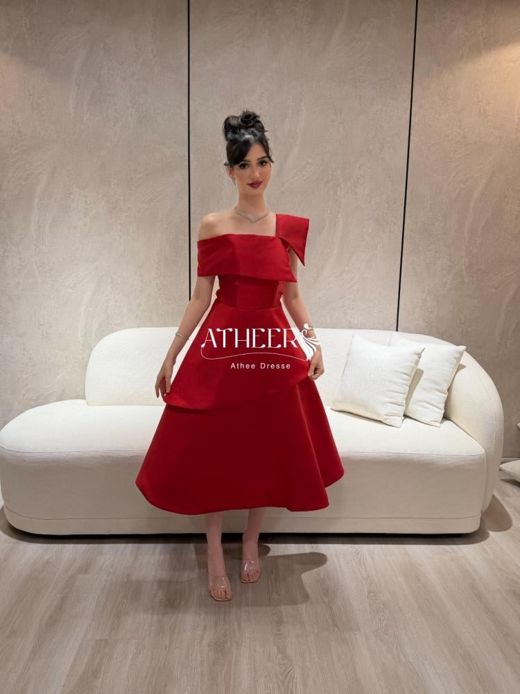 فستان سهره كلوش قصير احمر بكتف واحد | فستان جُمان