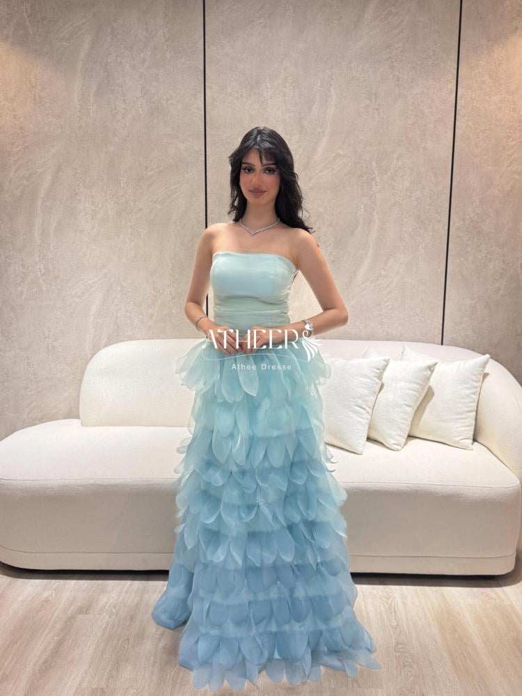 فستان “فيرا” يجمع بين الأناقة الحالمة وسحر التفاصيل الفريدة. لونه الأزرق السماوي يمنح إطلالة راقية مفعمة بالانتعاش، فيما يزينه تصميم طبقات الأوراق المتدرجة التي تنسدل برقة لتعكس حركة ناعمة مع كل خطوة. تصميمه العصري من دون أكمام يمنح لمسة أنثوية ملفتة تجعله خيارًا مثاليًا للسهرات والمناسبات الخاصة.