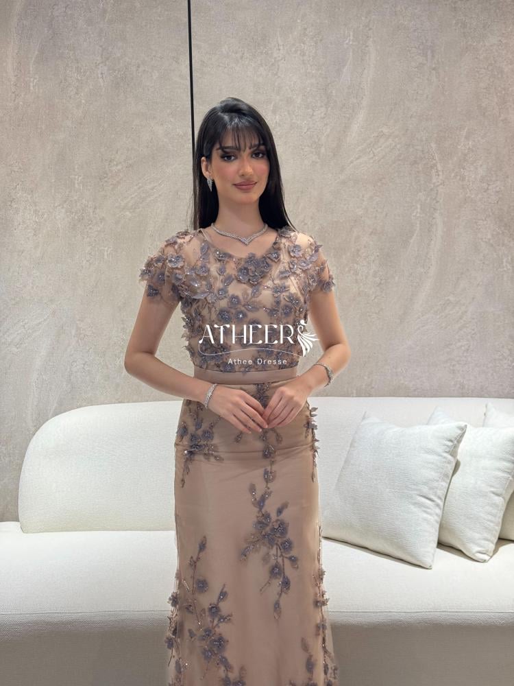 فستان سهره ناعم بيج مطرز بنفسجي من متجر فساتين أثير أفضل متجر فساتين سعودي بتصميمه الراقي وألوانه المتناغمة بين البيج والتطريزات البنفسجية، يمنحك إطلالة أنثوية متألقة تجمع بين الكلاسيكية والرقي. تفاصيله المطرزة بعناية تروي قصة جمال استثنائي يناسب جميع المناسبات الراقية.