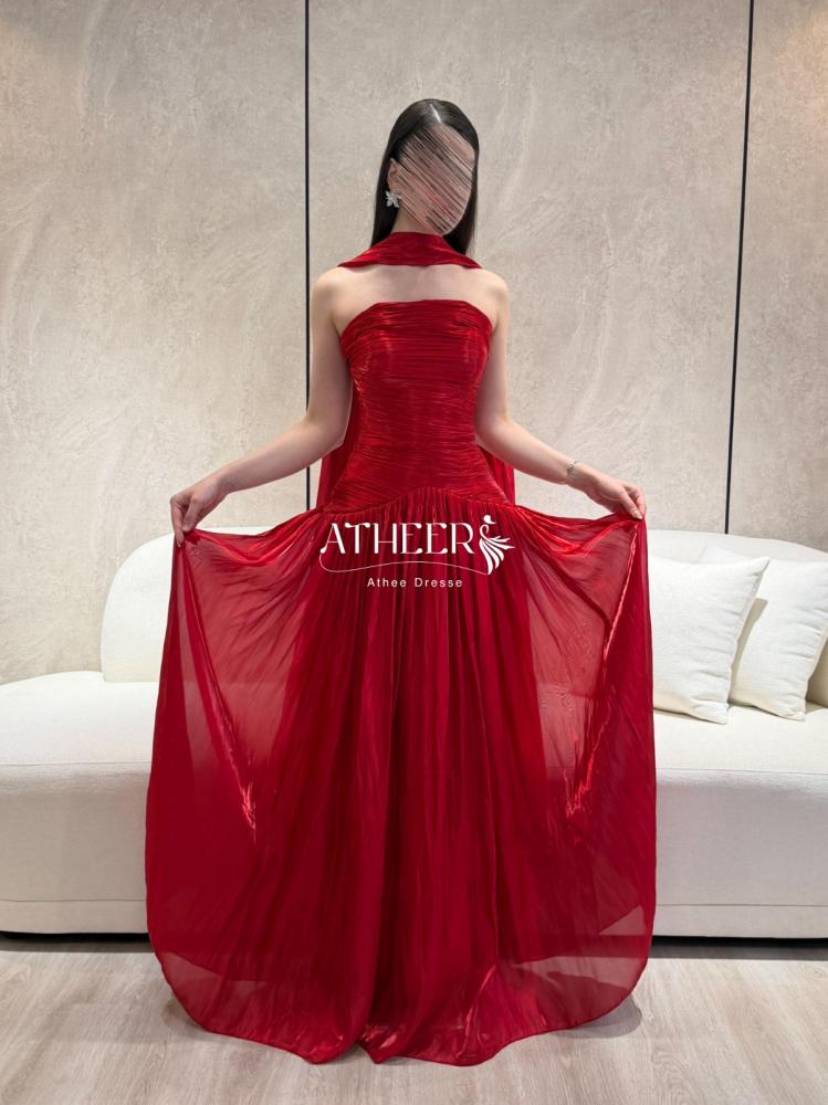 فستان سهره ناعم شيفون أحمر بقصة صدر كسرات وربطة عنق | فستان جود