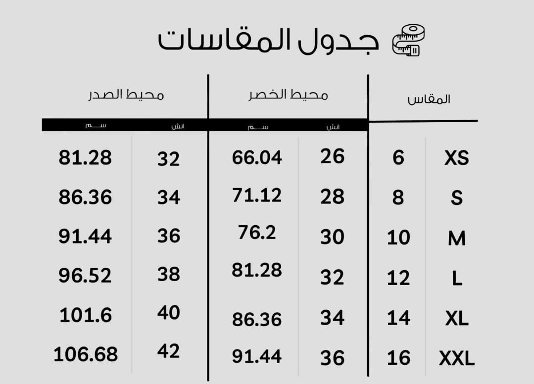 - المقاسات :( XS,S,M,L,XL،XXL)