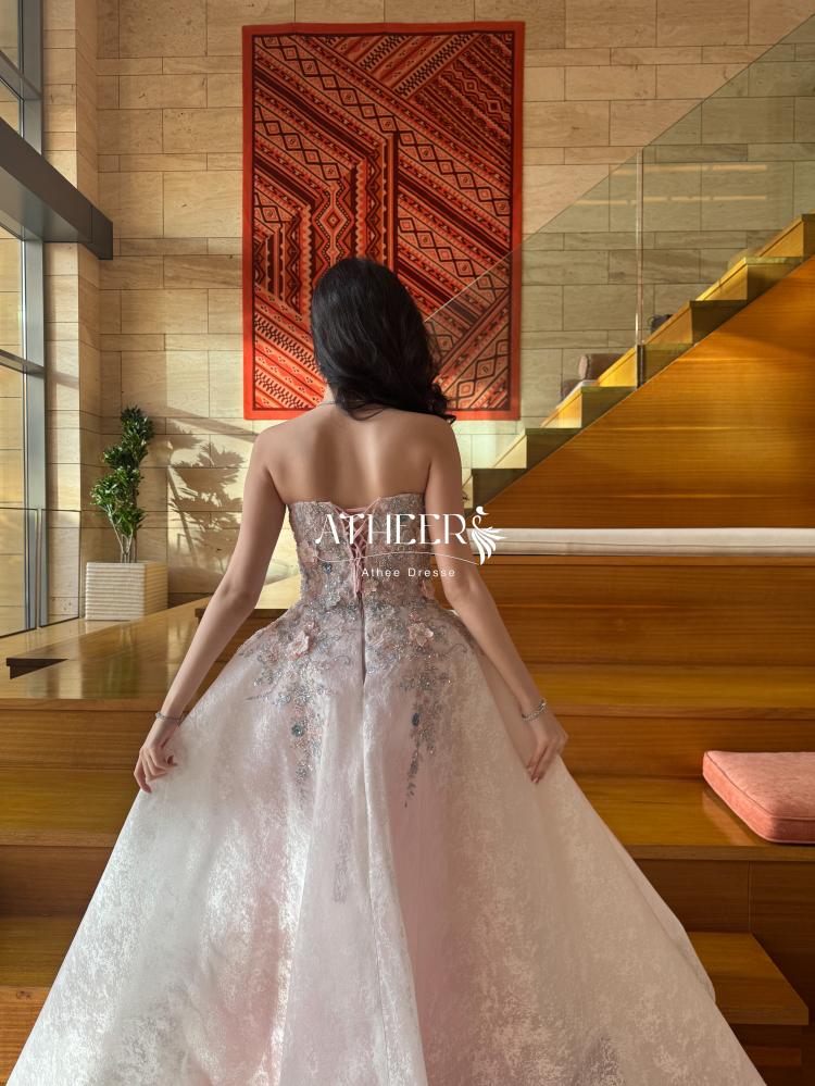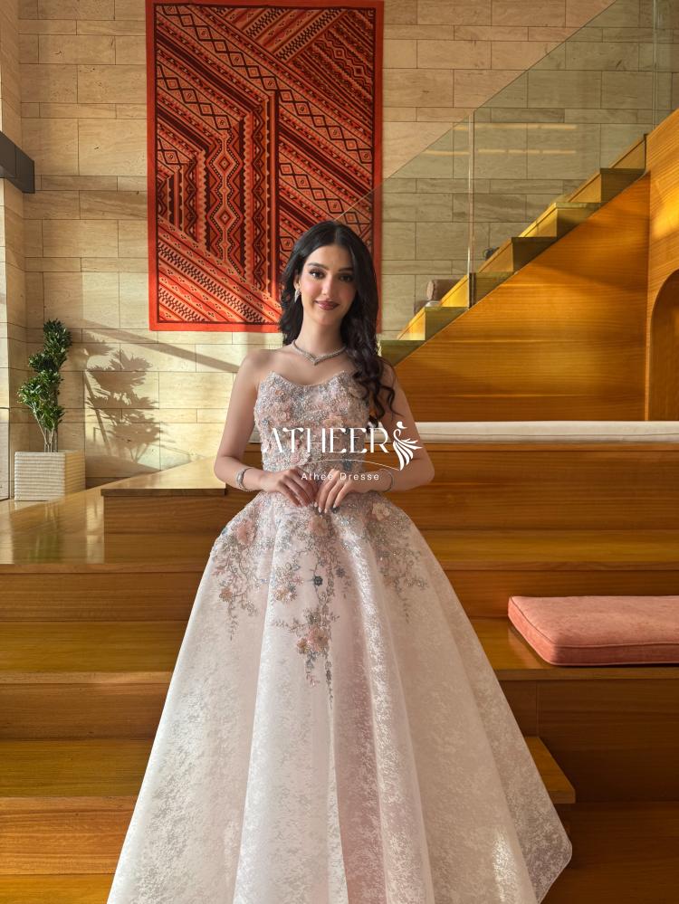 فستان كلوش سواريه طويل بقصة ملكية من متجر فساتين أثير أفضل متجر فساتين سعودي، بتصميم بدون أكتاف وتطريزات وردية ناعمة، يمنحك حضوراً ساحراً في المناسبات الرسمية والمميزة.